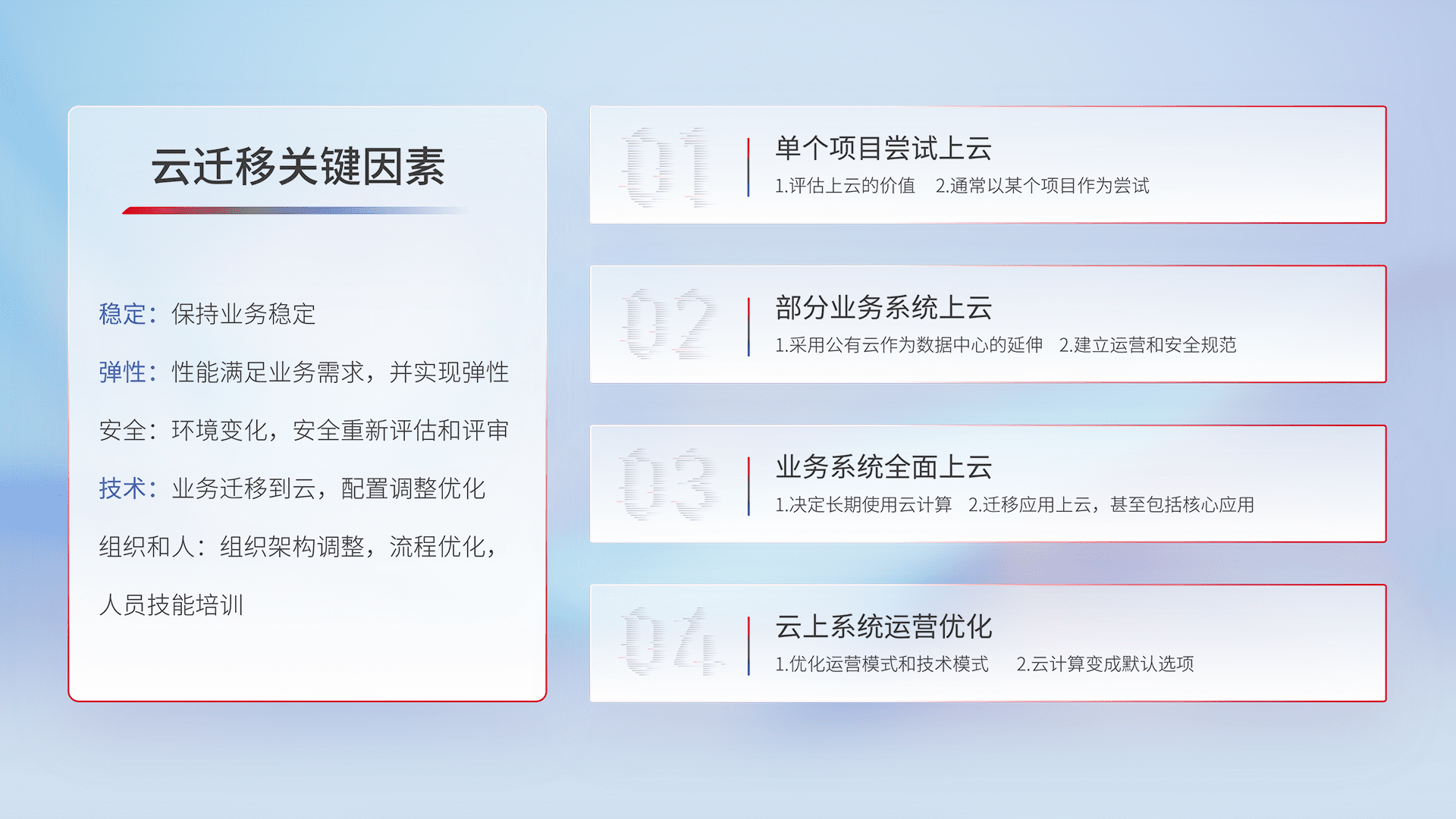 结合实际业务,,从规划设计、、、云平台选型、、、云原生改造、、数据迁移、、、、集成交付,,,迁移全过程为客户识别最佳上云路径,,,做好风险识别管理,,,设计网络架构、、、、身份权限、、、、安全审计合规、、操作审计、、、、日志审计、、、、监控告警策略、、、多站点容灾设计等,,,对云上基础设施进行整体规划,,提升IT治理水平,,,,以满足弹性、、、、高可用、、、、高性能的需求。。