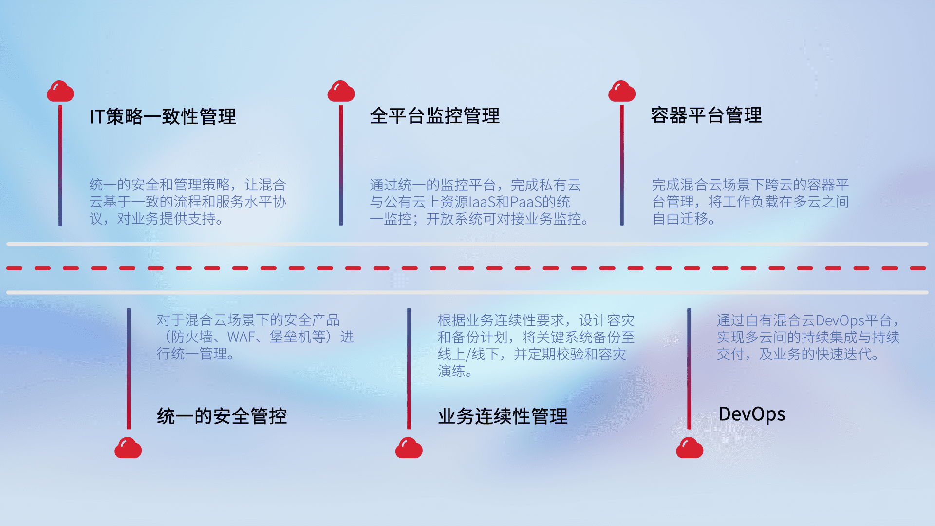 通过多云纳管,,,,以统一的资源数据模型把客户的云资源进行抽象和封装,,进而实现对多云资源的统一操作,,,,保障云资源管理的可靠性、、、、稳定性与可用性。。。。量身定制化运维内容,,配置、、开发运维、、、、补丁管理、、备份、、、、监控、、、、认证和访问管理、、、、审计和日常巡检等,,,,保障在用云过程中的可靠度,,,,稳定度以及高可用率。。。。